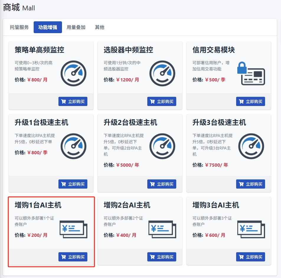 想要增加一個 **虛擬主機** ,可以在水母量化的 **商城** 中增購一臺AI主機 **(200元/月)** ;  ____________________________ 此外,如果您的積分充裕的話,可以在水母量化的 **積分商城** 中兌換一臺AI主機 **(2000積分/月)** ;