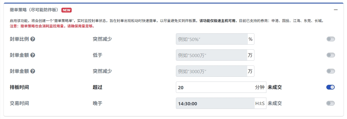 排板時(shí),如果 **排板時(shí)間過長(zhǎng)** ,一直未能成交,這樣 **資金利用率就比較低** ,我們可以在 **打板助手模板** 中設(shè)置 **撤單策略** :當(dāng)排板時(shí)間 **超過預(yù)設(shè)時(shí)長(zhǎng)仍未成交時(shí)** ,系統(tǒng)將 **自動(dòng)撤單** ,從而釋放資金,提高資金利用率。此外,撤單功能功能還有很多條件可選,如下圖所示:
