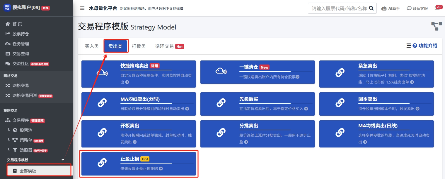 對于止盈止損的設置,我們系統(tǒng)有一個最簡單方便的模板: #### 路徑:全部模板→賣出類→止盈止損  __________________ #### 模板設置如下圖: