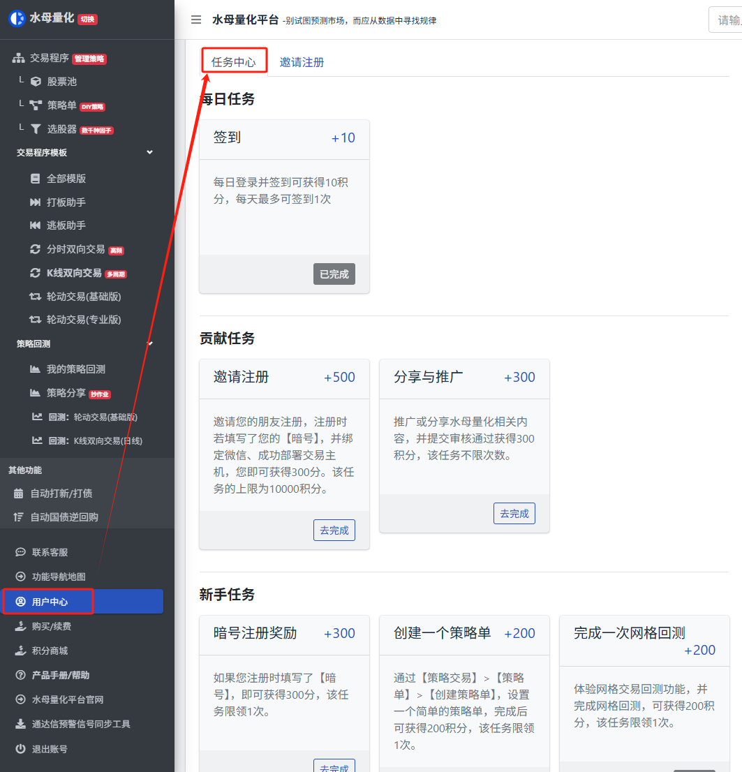 您好,水母量化的 **積分如何獲取** ?可通過(guò) **完成任務(wù)中心的每一項(xiàng)任務(wù)** 即可獲得相應(yīng)的積分。 **路徑:菜單→用戶中心→任務(wù)中心**