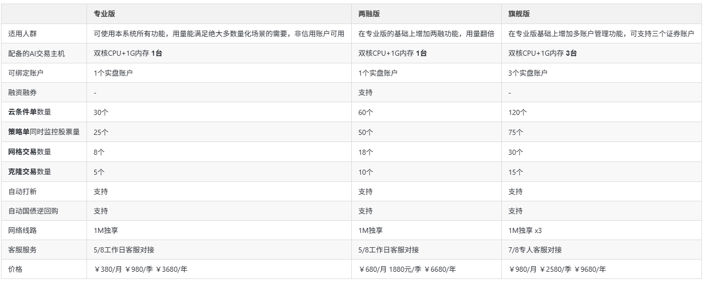 您好,以上 **三個版本的主要區(qū)別** ,如下圖所示:  更多詳細請點擊下方鏈接: https://wiki.yuncaijing.com/docs/jat/price
