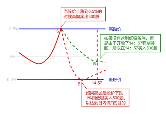您好, **日內(nèi)高拋低吸** 是一種短期交易策略,指的是在 **同一交易日** 中,投資者先 **以較高價(jià)格賣(mài)出某個(gè)資產(chǎn)并等待市場(chǎng)價(jià)格下跌到更低的水平時(shí)再以較低價(jià)格買(mǎi)入該資產(chǎn)** ,以獲得差價(jià)利潤(rùn)。 **舉一個(gè)簡(jiǎn)單的例子:** 李先生打算長(zhǎng)期持有某一只股票,想在日內(nèi)先賣(mài)后買(mǎi)而賺取日內(nèi)的利差收益,遂利用策略模板的日內(nèi)高拋低吸創(chuàng)建一個(gè)策略交易單,在高拋漲跌幅處填寫(xiě)0.5,回落低吸處填寫(xiě)1,尾盤(pán)是否接回選擇14:56強(qiáng)制接回,交易數(shù)量選擇500股,打開(kāi)預(yù)授權(quán)即完成。這樣當(dāng)該股票漲跌幅達(dá)到0.5%時(shí)即賣(mài)出,而后跌至-0.5時(shí)買(mǎi)入,如果盤(pán)中未跌至-0.5則會(huì)在14:56時(shí)以市價(jià)強(qiáng)制買(mǎi)入回來(lái)。 **日內(nèi)高拋低吸運(yùn)行原理圖:**
