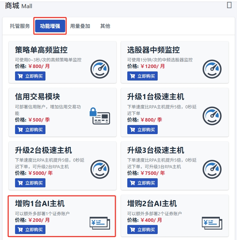 您好,您需要增加一個(gè)模擬盤賬戶作為測(cè)試用,可以直接在商城的 **【功能增強(qiáng)】** 欄目中 **增購(gòu)一臺(tái)AI主機(jī)** ,即可多一臺(tái)主機(jī)部署。