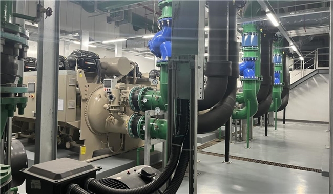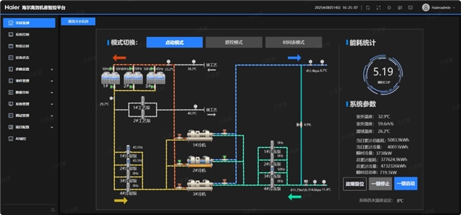 不同于行業(yè)單點(diǎn)節(jié)能改造,海爾通過BMS系統(tǒng)整合水機(jī)、模塊機(jī)及末端智控系統(tǒng),打通數(shù)據(jù)壁壘,實(shí)現(xiàn)全流程聯(lián)動(dòng),大幅降低集成成本。同時(shí),依托AI算法的高效機(jī)房能動(dòng)態(tài)優(yōu)化運(yùn)行參數(shù),磁懸浮空調(diào)主機(jī)、冷卻塔智能調(diào)節(jié),使系統(tǒng)COP平均達(dá)5.5,遠(yuǎn)超傳統(tǒng)工業(yè)空調(diào)低于3.0的水平,有效縮短零碳改造回本周期。