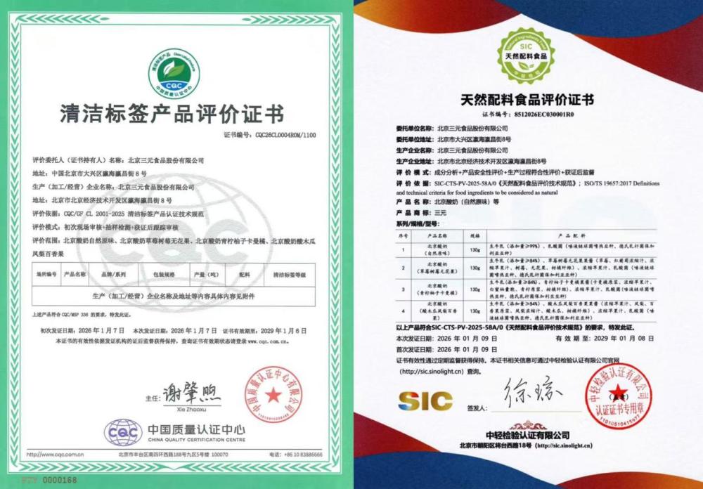 相關負責人表示,“三元北京酸奶”最大的底氣,在于其獲得的兩項國家級權威背書——中國質量認證中心(CQC)頒發(fā)的清潔標簽0級評價與中輕檢驗認證有限公司(SIC)頒發(fā)的天然配料食品評價。